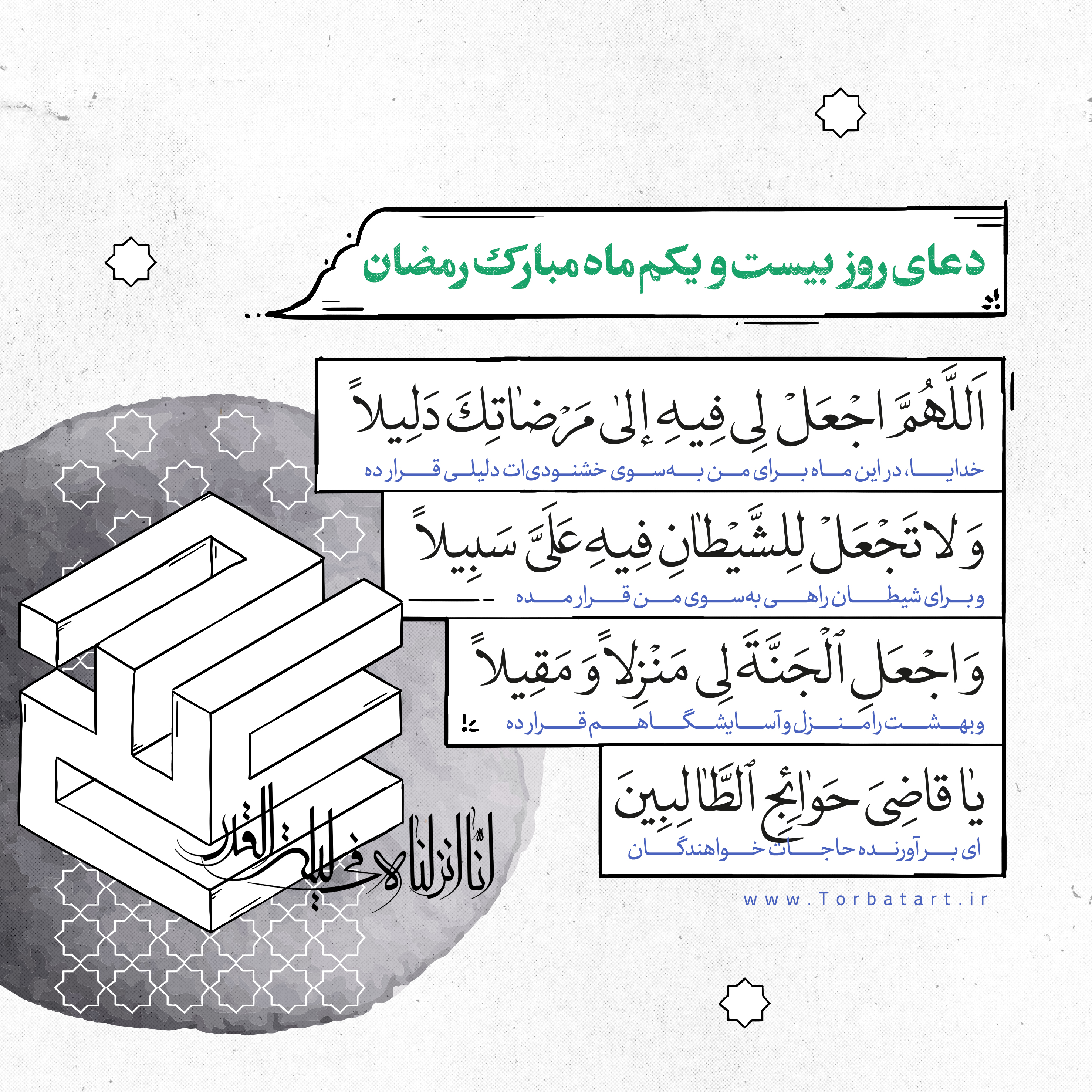 اللَّهُمَّ ارْزُقْنِی فِیهِ فَضْلَ لَیْلَةِ القَدْرِ وَ صَیِّرْ أُمُورِی فِیهِ مِنَ الْعُسْرِ إلَى الْـیُسْرِ وَ اقْبَلْ مَـعَاذِیرِی وَ حُطَّ عَنِّیَ الذَّنْبَ وَ الْوِزْرَ یَا رَؤُفاً بِعِبَادِهِ الصَّالِحِینَ