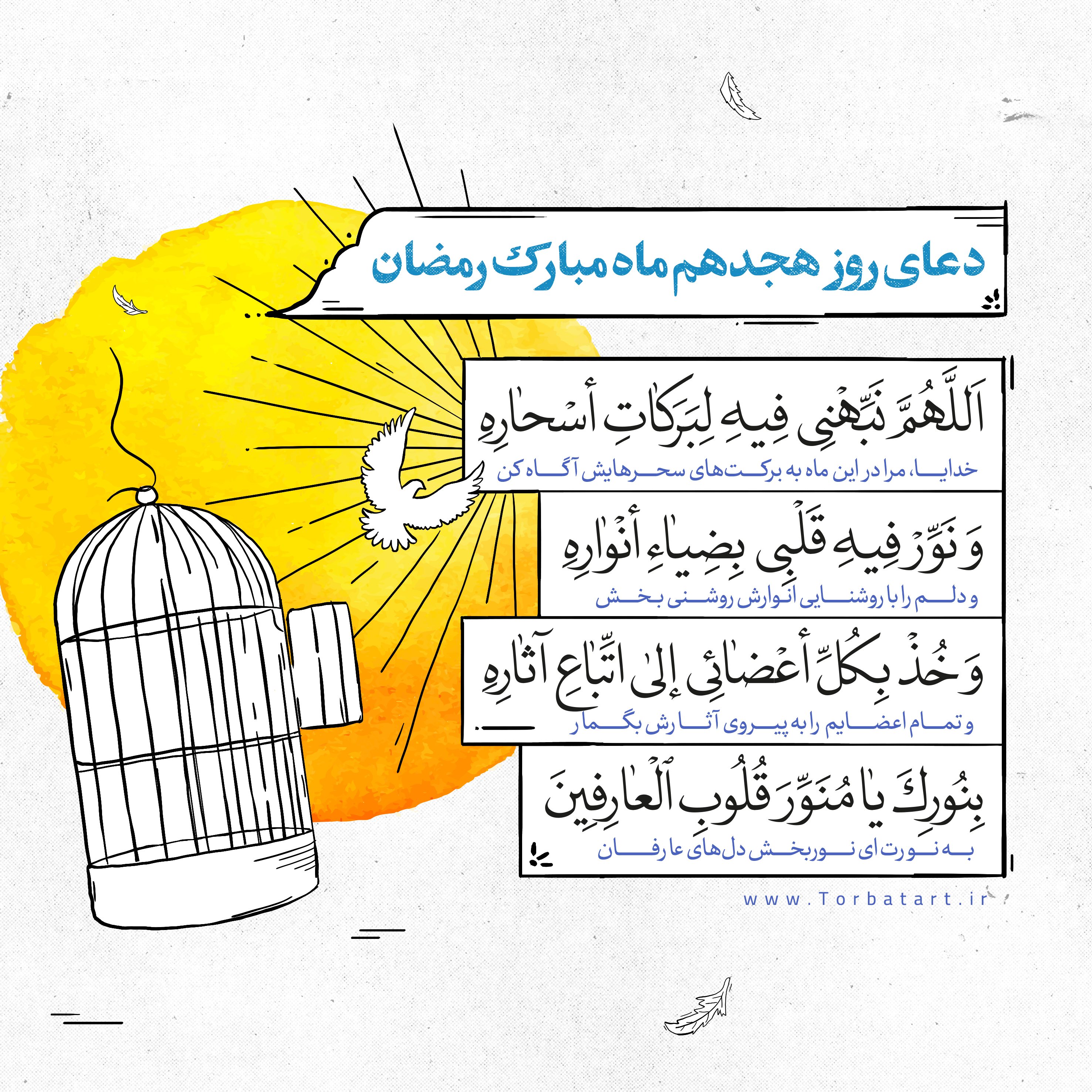 خدایا، مرا در این ماه به برکتهای سحرهایش آگاه کن و دلم را با روشنایی انوارش روشنی بخش و تمام اعضایم را به پیروی آثارش بگمار، به نورت ای نوربخش دلهای عارفان