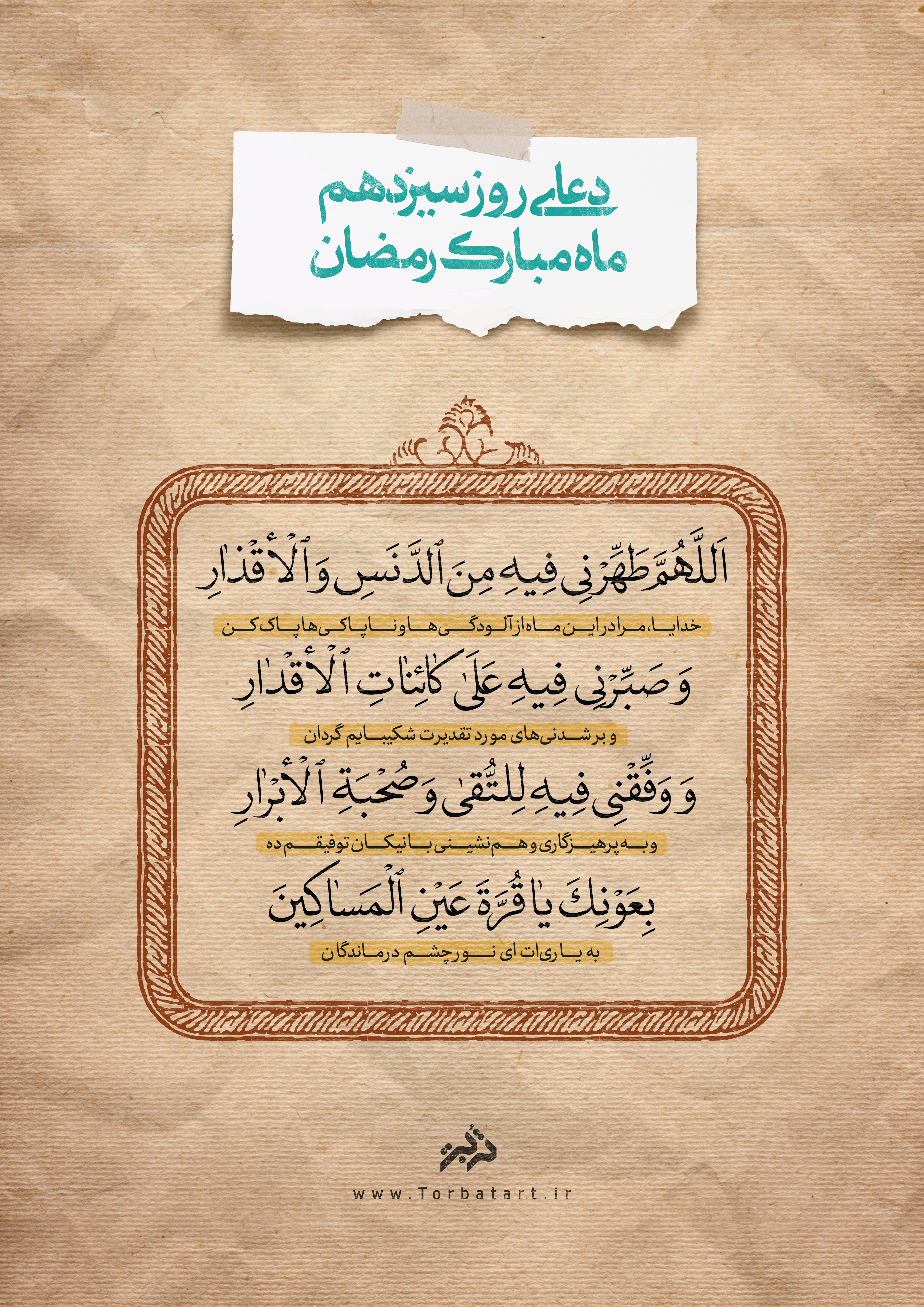 خدایـا، مرا در ایـــن مـــاه به پوشـــش و پاکدامـــنی بیـــارای و لبـاس قنـــاعت و انـدازه نگــــهداشتـن را در زنـــدگی به من بپوشـــان و مـــرا در ایـــن مـــاه بر عـدالت و انصــاف وادارم کـن و از هـرچــه میتــرســـم ایـــمنــــی ده به نگهداریات ای نگـــهـدارنـــده هــراســــندگــان
